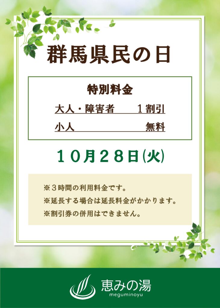 10月28日(火)は群馬県民の日です。県民に限らずどなたでも入館料がお得になります。大人・障がい者は1割引き(大人540円、障がい者360円)、小学生以下のお子様は無料です。この機会にぜひお越しください。※3時間までのご利用です。延長する場合は別途延長料金がかかります。