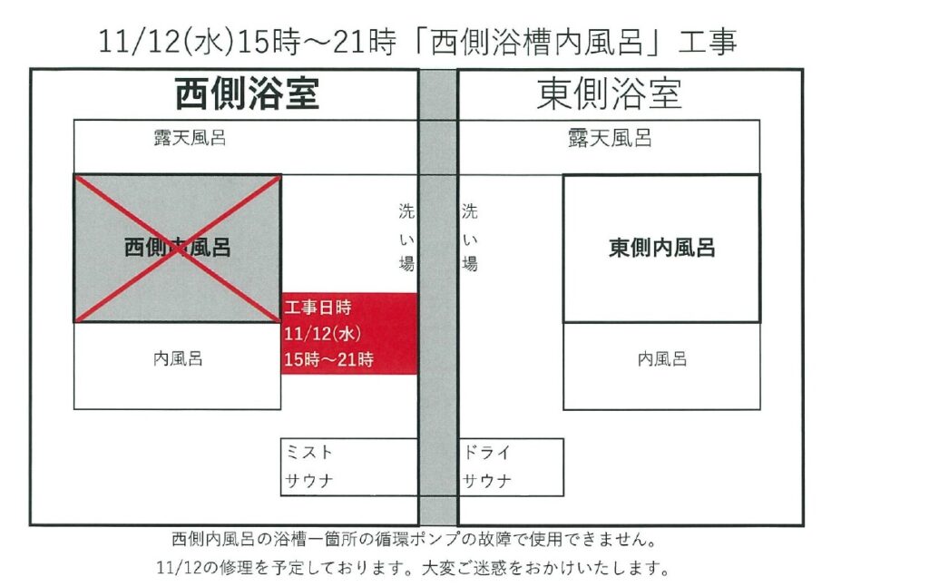 11/12(水)一部浴槽工事について 2025年11月7日 お知らせ megumispa 11/12(水)の15時~21時、西側内風呂の一か所が使用できなくなる予定です。ご迷惑をおかけしますが、よろしくお願いいたします。